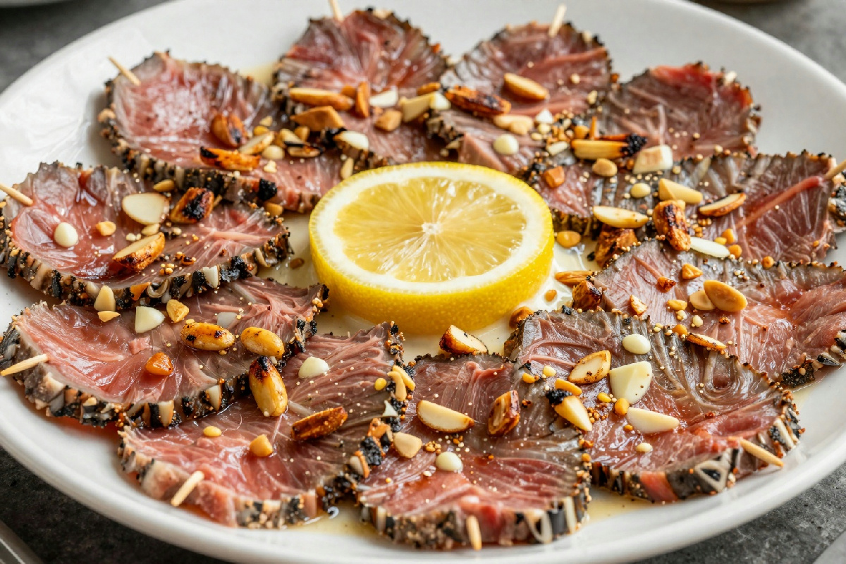 Le mandorle tostate sono un altro elemento chiave. La tostatura esalta il loro sapore e la loro croccantezza, creando un contrasto piacevole con la tenerezza del carpaccio. Si possono utilizzare sia mandorle a lamelle, da cospargere sugli spiedini, sia intere, per un effetto visivo più interessante. Te lo dico per esperienza: le mandorle a lamelle non solo sono più croccanti, ma si distribuiscono meglio su ogni spiedino, regalando un tocco di eleganza al piatto.